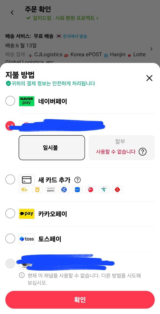 - 알리익스프레스 앱 또는 웹에서 결제 수단에 해당 카드 등록